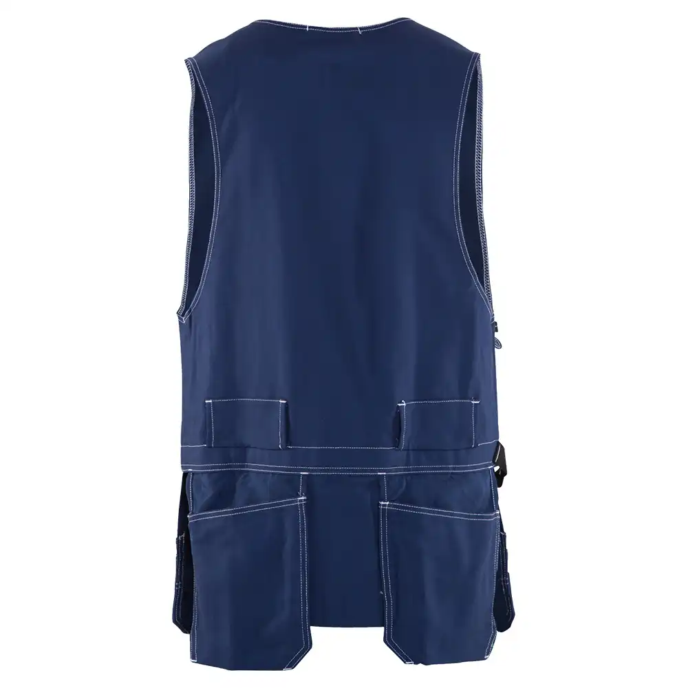 Die Montageweste „3105“ von BLAKLÄDER® ist ein guter Begleiter für harte Arbeiten mit viel Werkzeug. Das Obermaterial ist aus einem kräftigen Baumwoll-Köpergewebe gefertigt, welches dank des hohen Materialgewichts von ca. 370g/m² hervorragende Abriebfestigkeit bietet. Der gerade Schnitt bietet dabei ein hohes Maß an Bewegungsfreiheit und viel Platz für Unterbekleidung. Der Rücken ist mit einer großen Verlängerung geschnitten, welche Ihre Arbeitshose vor Verschmutzungen bewahrt.Verschlossen wird die Arbeitsweste über einen durchgehenden Frontreißverschluss aus Metall, welcher mit einer praktischen Abdeckleiste versehen ist. Dank der vier breiten Gürtelschlaufen können Sie am Gürtel weitere Utensilien, wie z.B. eine Hammerschlaufe, anbringen. Gleichzeitig wird das Gewicht der voll beladenen Weste so gleichzeitig auf Schultern und Hüft verteilt. In den praktischen Taschenkombinationen mit verstärkten Hängetaschen finden Sie zudem genügend Stauraum für alle Arbeitsutensilien, sowie Werkzeug und Kleinteile.