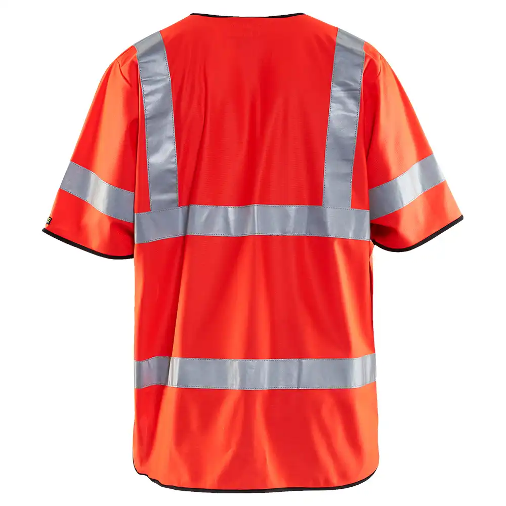 Die Warnweste „3023“ von BLAKLÄDER® ist ein guter Begleiter für schnellen Warnschutz. Das Obermaterial ist aus einem robusten Polyester-Gewebe gefertigt, welche für eine höhere Langlebigkeit mit einem Antipilling-Schutz versehen ist. Durch das geringe Materialgewicht von ca. 125g/m² liegt die Weste zudem angenehm luftig auf der Haut. Durch das fluoreszierende Obermaterial, sowie die breiten Reflexstreifen um Torso, Schultern und Ärmel, ist die Weste mit der höchsten Warnschutzklasse 3 der EN ISO 20471 ausgezeichnet. Verschlossen wird sie über einen Kunststoff-Reißverschluss auf der Vorderseite, der in einem V-Ausschnitt endet. Durch den geraden und geräumigen Schnitt passt sie zudem problemlos über Ihre reguläre Arbeitskleidung. Das verlängerte Rückenteil sorgt gleichzeitig für optimalen Schutz auch bei gebückten Arbeiten.