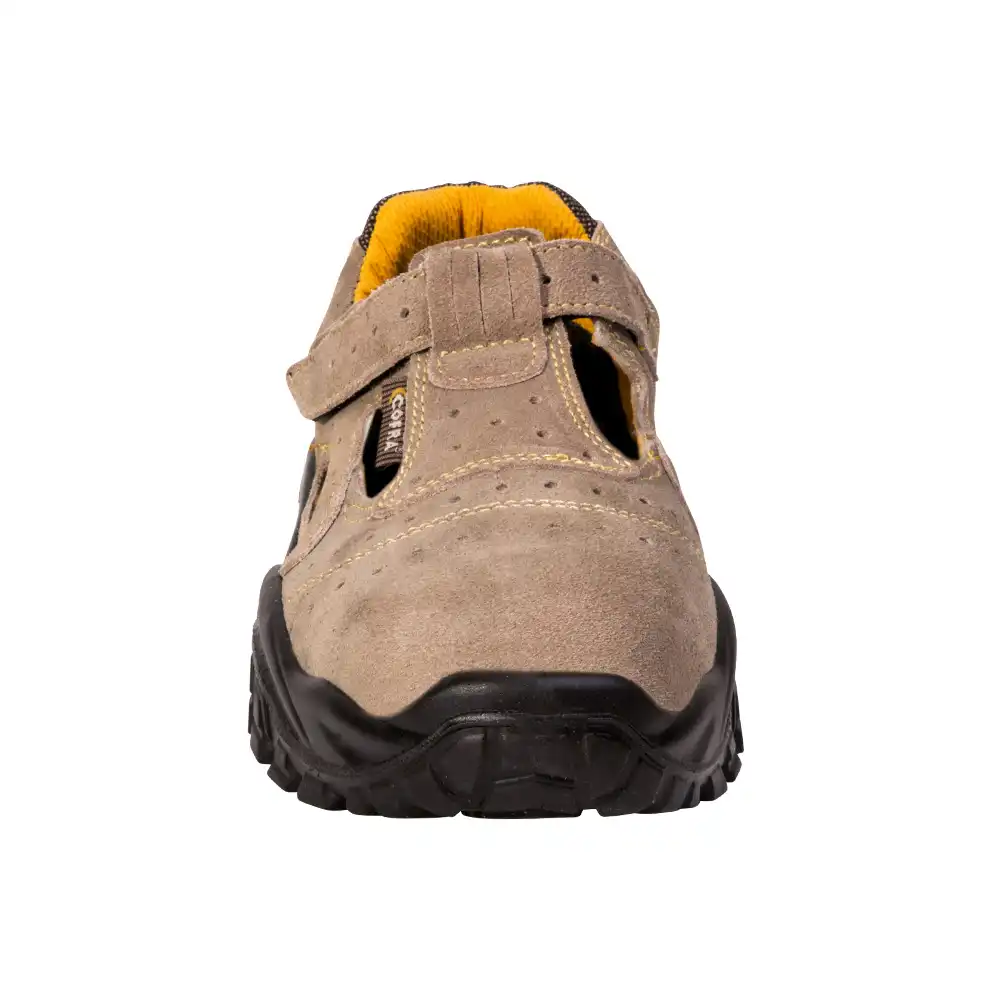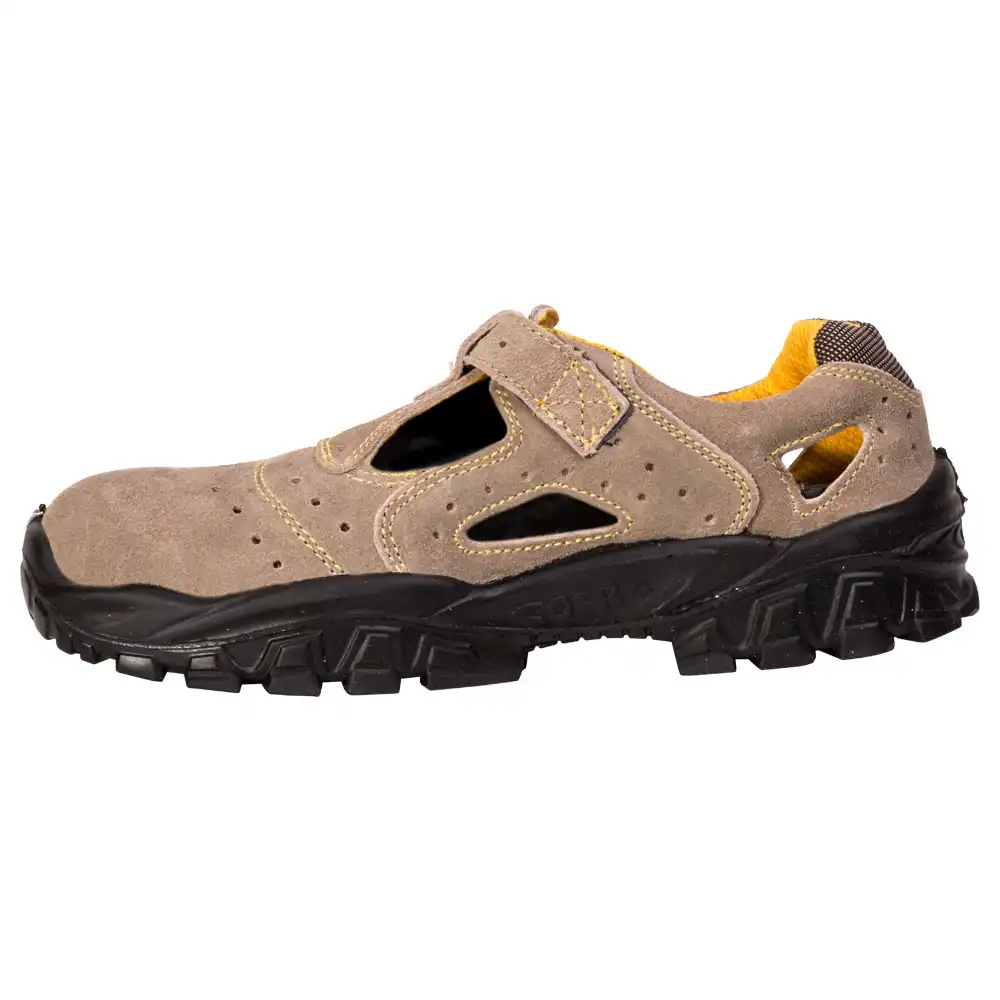 Die Sicherheitssandalen "New Brenta" aus der Cofra® Techno-Reihe überzeugen mit hochwertigen Materialien und sind der ideale Partner für warme Temperaturen. Das Obermaterial aus gelochtem VeloursLeder ist besonders robust und atmungsaktiv. Im Inneren ist der Schuh mit einem Feuchtigkeitregulierendem Polyamid ausgestattet. Das Fußbett sorgt mit seiner anatomisch angepassten Form für optimalen Halt und die Zehenschutzkappe aus Stahl schützt Sie vor Verletzungen. Außerdem ist der Klettverschluss dieser Cofra® Sandale verstellbar.