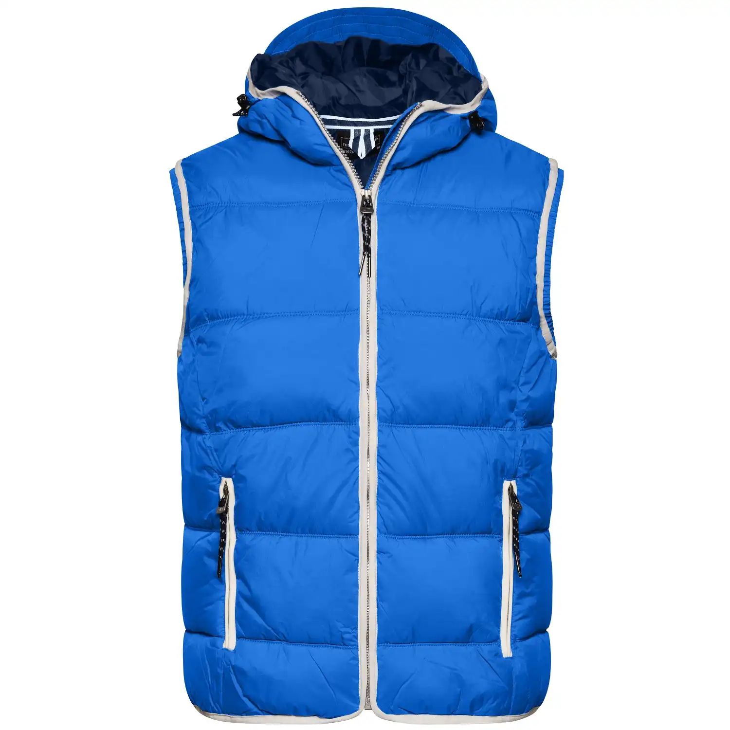 Die Herren Maritime Weste "JN1076" von Daiber ist eine modische Steppweste, ideal für den Alltag. Das Obermaterial besteht zu 100% aus Polyamid. Die matte Oberfläche der Weste ist mit einer leichten TPU- Beschichtung versehen. Ebenso ist die Jacke wind – und wasserabweisend. Der elastische Abschluss am Armloch sorgt für eine perfekte Passform. Für die Optik sind an der Weste kontrastfarbige Einfassungen angebracht. An der Kapuze befindet sich eine elastische Kordel mit einem Stopper, somit kann die Weite individuell eingestellt werden. Außerdem verfügt die Maritime Weste über zwei Fronttaschen und einer Brusttasche innen, die auch als Stauraum dienen.Besonderheiten