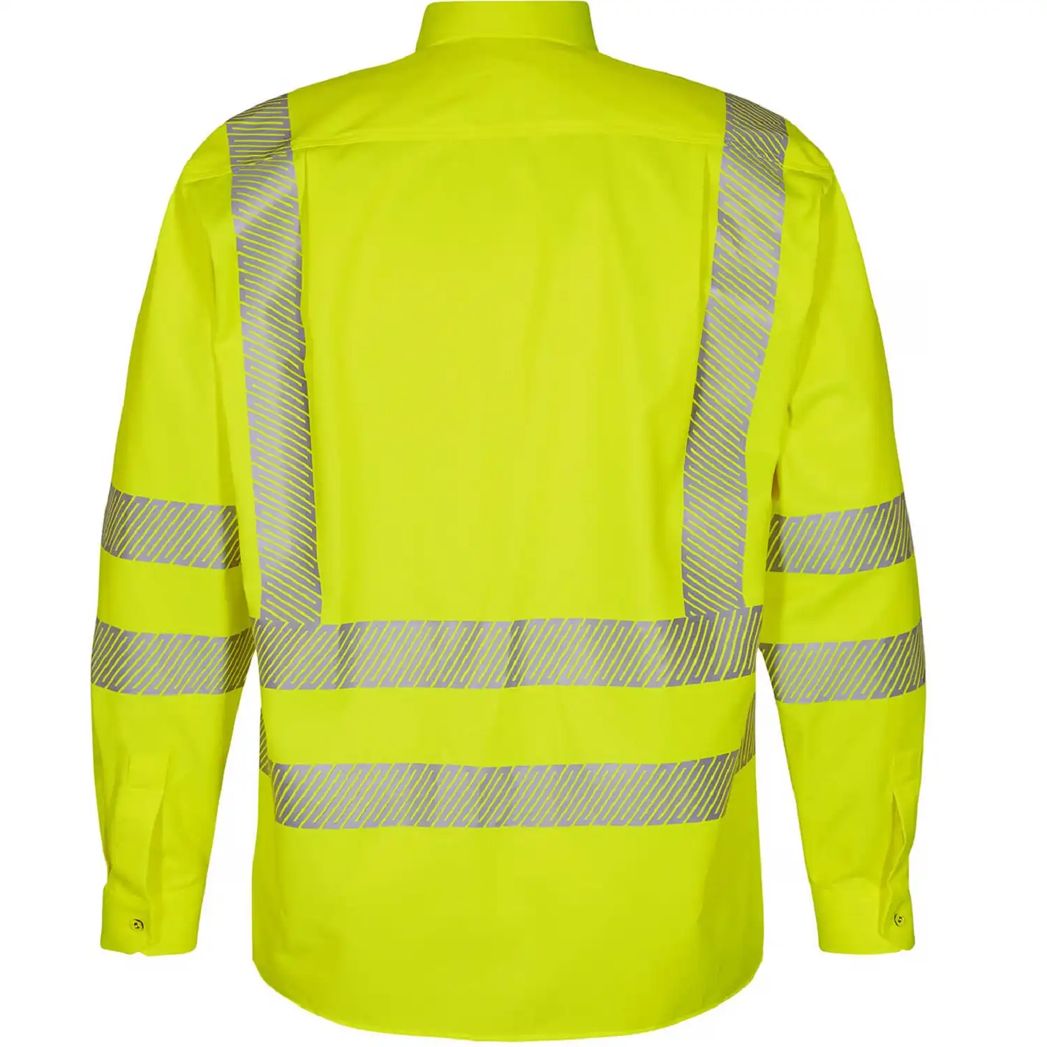 Verschlossen wird das Arbeitshemd über eine durchgehende Druckknopfleiste mit Abdeckung, die in einem klassischen Umlegekragen endet. Für einen sicheren Sitz können die Manschetten über Druckknöpfe in der Weite verstellt werden. Der Rücken ist gleichzeitig verlängert geschnitten, um bei viel Bewegung nicht aus der Hose zu rutschen. Das fluoreszierende Obermaterial mit breiten Reflexstreifen um Torso, Schultern und Ärmel verleiht dem Hemd gleichzeitig die Warnschutzklasse 3 der EN ISO 20471.