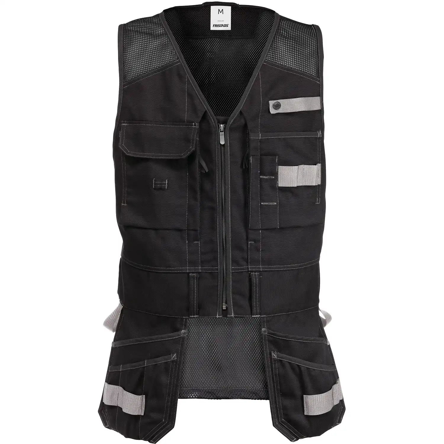 Die Montageweste „5905 CYD“ von FRISTADS® ist ein hervorragender Begleiter für Arbeiten mit vielen Kleinteilen in warmen Umgebungen. Das Obermaterial ist aus einem strapazierfähigen Mischgewebe mit ca. 60% Baumwolle gefertigt, welches dank des Materialgewichts von ca. 330g/m² gute Abriebfestigkeit bietet. Um den Tragekomfort zu erhöhen sind die Schultern und der gesamte Rücken aus einem hervorragend ventilierenden Mesh-Gewebe gefertigt, um übermäßige Schweißbildung zu mindern.Der Schnitt ist dabei gerade gehalten, um Ihnen optimale Bewegungsfreiheit zu bieten. Verschlossen wird die Weste über einen durchgehenden Frontreißverschluss, der in einem tiefen V-Ausschnitt endet. Der Rücken ist gleichzeitig verlängert geschnitten, um bessere Abdeckung bei gebückten Arbeiten zu bieten. Am Bund sind zusätzlich breite Gürtelschlaufen angebracht, um das Gewicht der voll beladenen Weste gleichmäßig auf Schultern und Hüfte zu verteilen.