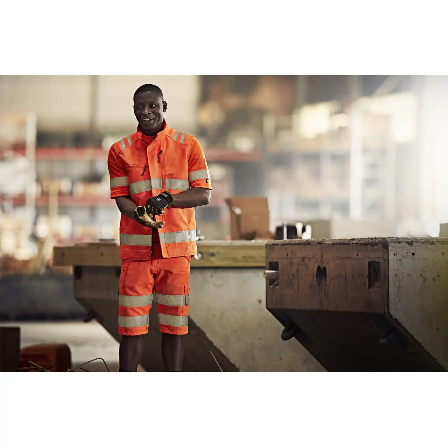 Um die nötige Sicherheit kümmert sich das fluoreszierende Obermaterial, welches der Arbeitsweste, zusammen mit den breiten Reflexstreifen, die Warnschutzklasse 2 der EN ISO 20471 verleiht. Zusätzlich ist die Farbe „orange" gemäß der RIS-3279-TOM Ausgabe 1 des UK Railway Standard zugelassen.
