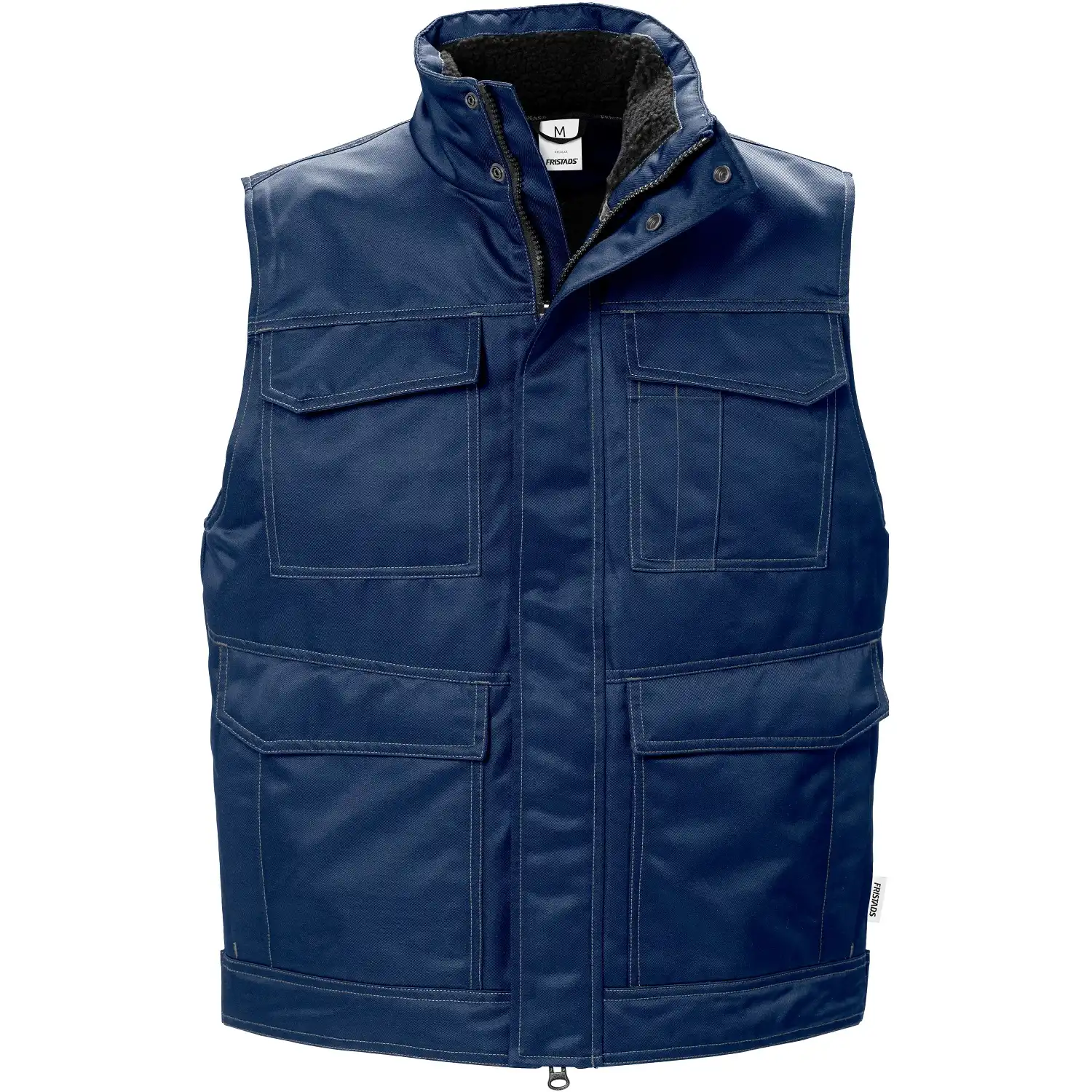 Die Winterweste „5050 PP“ von FRISTADS® ist ein praktischer Begleiter für kühle Umgebungen. Das Obermaterial ist aus einem robusten Polyestergewebe mit ca. 255g/m² gefertigt, welches mit der schmutz- und ölabweisenden Polydex-Beschichtung versehen ist. Der gerade Schnitt bietet gleichzeitig ein hohes Maß an Bewegungsfreiheit und genügend Platz für wärmende Unterbekleidung. Im Inneren der Arbeitsweste ist ein weiches Polyester-Webpelzfutter eingesetzt, welches kuschelig weich auf der Haut liegt und für angenehme Wärme sorgt.Verschlossen wird die Weste über einen durchgehenden 2-Wege-Frontreißverschluss, welcher mit Druckknöpfen und einer breiten Windschutzleiste verdeckt ist. Dieser endet in einem hohen Stehkragen, dessen weiches Futter sich angenehm an Ihren Hals anschmiegt und diesen so vor starken Windböen schützt. Der Rücken ist gleichzeitig verlängert geschnitten, um auch bei Arbeiten in gebückter Haltung gute Abdeckung zu bieten. Für eine optimale Passform kann die Bundweite über Druckknöpfe individuell angepasst werden.