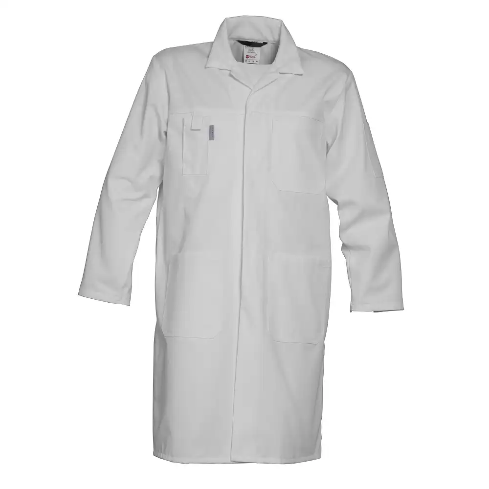Der Berufsmantel "4023" von HAVEP® aus der HAVEP® Basic Serie ist ein klassischer Begleiter für Industrie und Handwerk. Das Obermaterial ist aus einem klassischen Baumwoll-Gewebe gefertigt, welches durch ein Materialgewicht von ca. 300g/m² gute Abriebfestigkeit bietet. Der Schnitt ist dabei gerade gehalten, um auch beim Tragen über anderen Kleidungsstücken eine gute Bewegungsfreiheit zu bieten. Die Bewegungsfreiheit wird zusätzlich durch die Rückenfalten weiter erhöht.Verschlossen wird der Arbeitsmantel über einen verdeckten Druckknopfverschluss. Dank der vielen praktischen Taschen können Sie Ihre Arbeitsutensilien stets bei sich tragen.