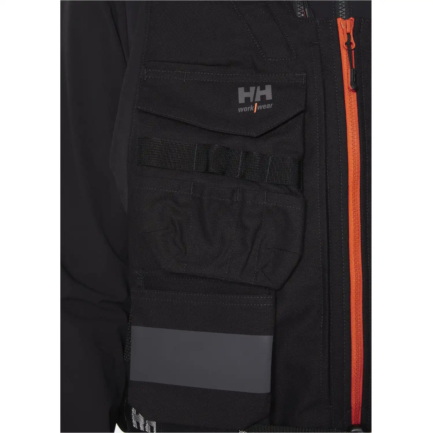 • 1 Brusttasche mit Patte, Werkzeugfächern, Werkzeugschlaufen und Handyfach, rechts