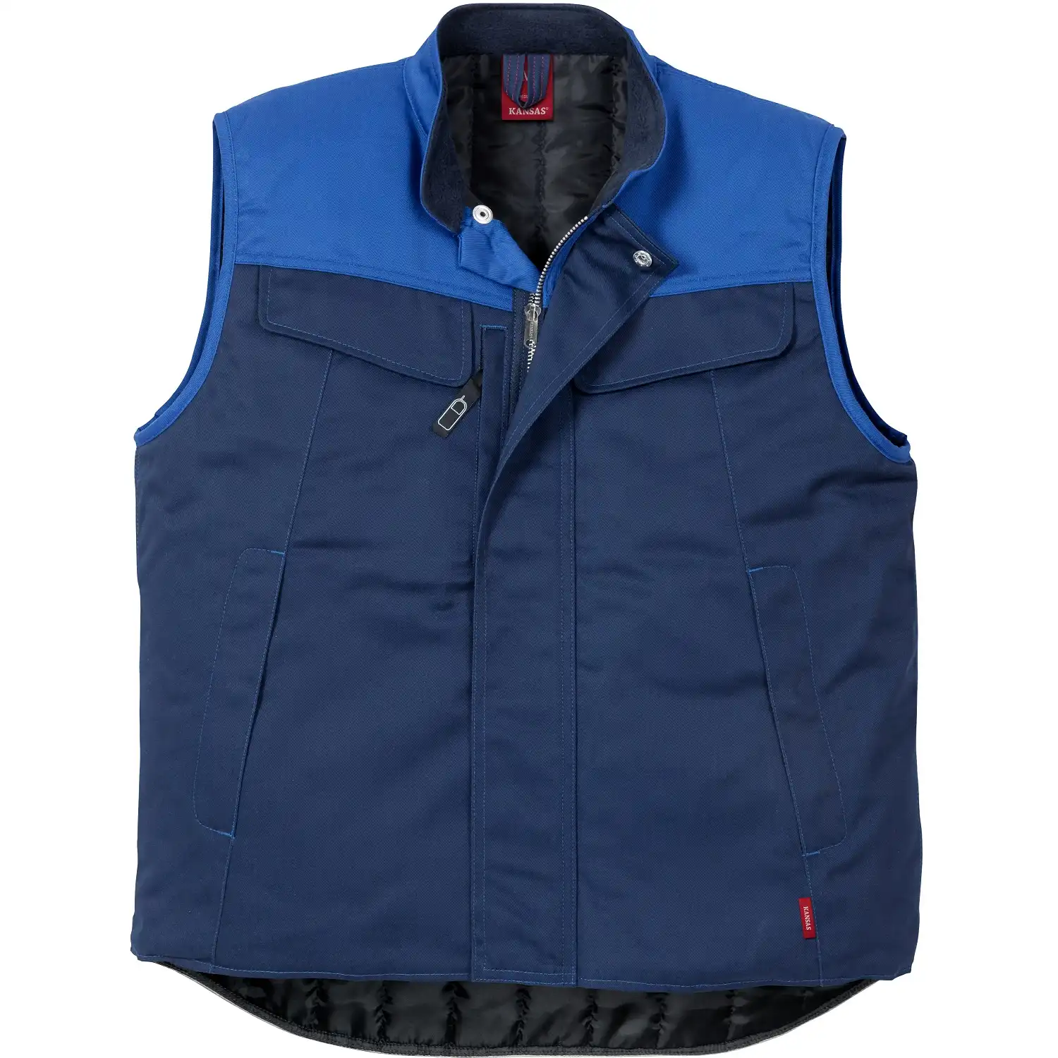 Die Winterweste „5312“ Icon Two Luxe von KANSAS® ist ein praktischer Begleiter für kühlere Arbeitsumgebungen. Das Obermaterial ist einem klassischen Mischgewebe mit ca. 65% Polyester gefertigt, welches dank des Materialgewichts von ca. 295g/m² gute Abriebfestigkeit bietet. Im Inneren ist gleichzeitig ein weiches Thermo-Steppfutter eingesetzt, welches auch in kalten Umgebungen angenehme Wärme spendet. Durch den geraden Schnitt haben Sie viel Bewegungsfreizeit und zudem genügend Platz für Unterbekleidung.Verschlossen wird die Arbeitsweste über einen durchgehenden Frontreißverschluss mit Abdeckleiste und Druckknöpfen, der in einem weichen Stehkragen endet. Der Rücken ist gleichzeitig verlängert geschnitten, um auch bei gebückten Arbeiten gute Abdeckung zu bieten. Robuste 3-fach-Kappnähte sorgen dabei für eine hohe Strapazierfähigkeit.
