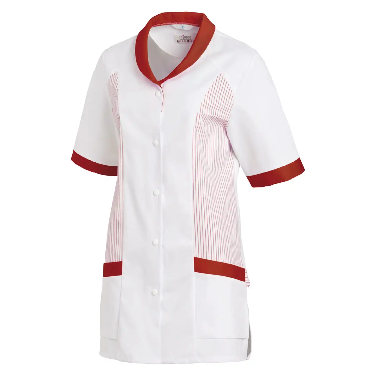 Der Hosenkasack Halbarm "08/800" von LEIBER® ist durch sein klassisches Design ideal für den Einsatz im Bereich der Gastronomie. Das Obermaterial besteht aus einem Mischgewebe, mit einem Baumwollanteil von 35%, was den Kasack angenehm weich macht. Für die Optik besitzt der Kasack ein modisches Streifenmuster an den Seiten, sowie kontrastfarbige Applikationen an dem Kragen, Ärmeln und Taschen. Die Seitenschlitze sorgen für eine bessere Bewegungsfreiheit. Er verfügt außerdem über zwei seitliche Einschubtaschen, welche als Stauraum dienen. Verschlossen wird der Hosenkasack über eine vordere Druckknopfleiste. Der Hosenkasack ist für die Industrieaäsche geeignet.Besonderheiten