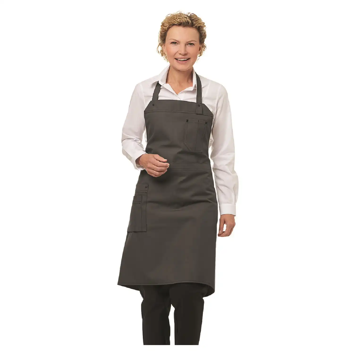 Die Latzschürze ist versehen mit diversen Nieten, einer Brusttasche und einer Seitentasche, die auch als Stauraum dienen.