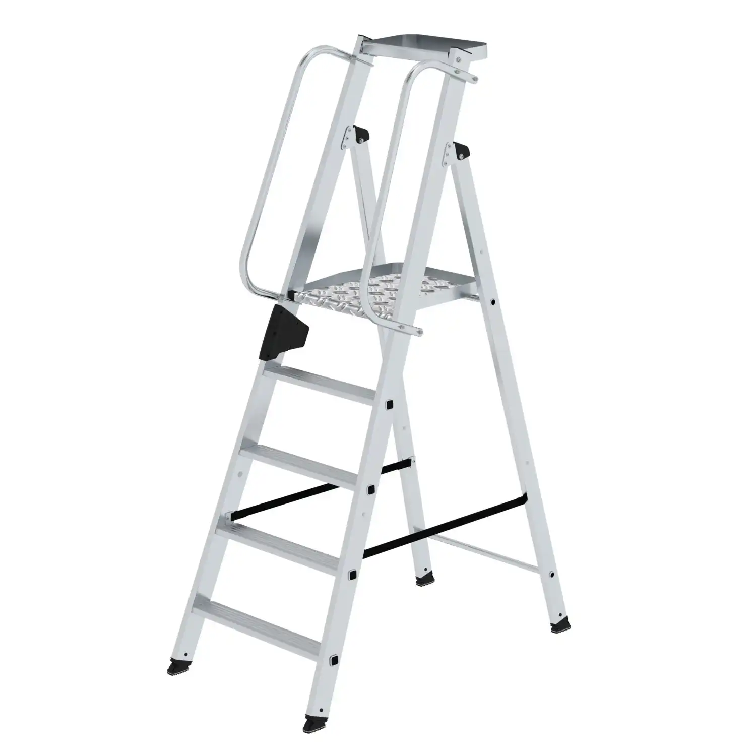 Die Plattformleiter von MUNK® aus Aluminium bietet dir eine sichere Arbeitsplattform mit integrierter Ablageschale. Mit stabilen Rechteckrohr-Holmen, 80 mm tiefen, geriffelten Stufen und zwei Handläufen ermöglicht sie komfortables Arbeiten über längere Zeiträume. Die Leiter ist freistehend und einseitig begehbar, wodurch du ohne zusätzliche Konstruktion direkten Zugang zur Plattform hast.