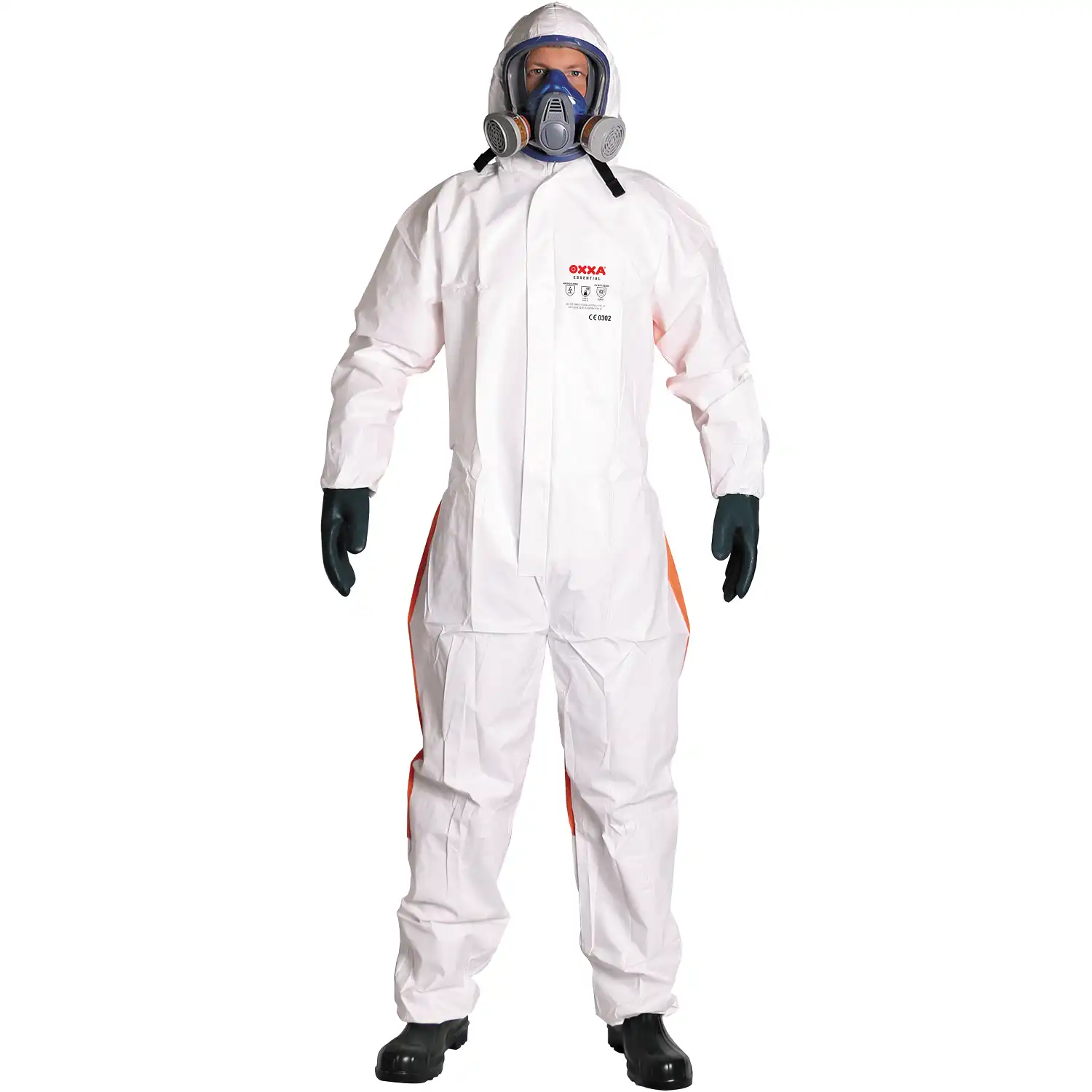 Der PP/PE-Einwegoverall Typ 5/6 „OWEN" 8250 aus der Essential-Serie von OXXA® ist ein schützender Begleiter für allgemeine Arbeiten in warmen Umgebungen. Gefertigt ist der Anzug aus laminiertem, mikroporösem Vlies, welches durch die Mischung aus PE und PP angenehmen Tragekomfort bietet. Der Rücken ist aus einem orangenem SMS-Material gefertigt, welches Luft und Luftfeuchtigkeit durchlässt und somit hervorragenden Komfort an warmen Tagen bietet. Dabei ist der Overall silikonfrei verarbeitet, wodurch er sich ideal zum Lackieren eignet.