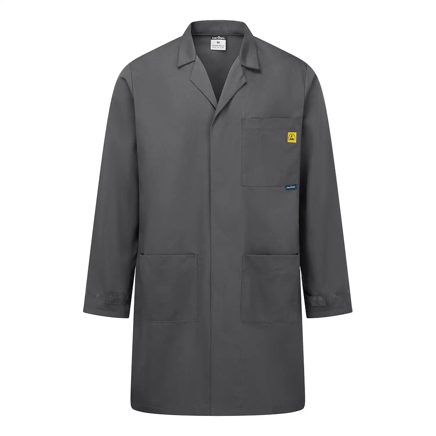 Die hochwertige ESD Arbeitsjacke „AS10“ von PORTWEST® richtet sich gezielt an Umgebungen, in denen elektrostatische Ableitfähigkeit gefragt ist. Das Außenmaterial besteht aus einer langlebigen, pflegeleichten und komfortabler Materialzusammensetzung (65 % Polyester, 34 % Baumwolle, 1 % leitfähige Faser). Dank verdeckter Druckknopfleiste und verstellbaren Manschetten bietet die Jacke praktische Funktionalität mit Stil. Ob im Labor, in der Elektronikfertigung oder im ESD-geschützten Bereich – diese Jacke vereint eine klare Optik mit Funktion.