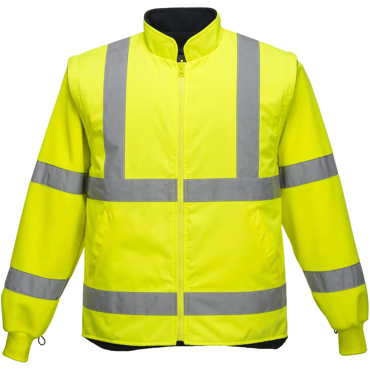 Die Warnschutz Winterjacke 5in1 „S766“ aus der Essential-Serie von PORTWEST® ist eine optimale Wahl für das ganze Jahr. Das Jacken-System besteht dabei aus einer wetterfesten Außenjacke und einer modularen Futter-Innenjacke. Die Außenjacke ist aus einem strapazierfähigen 300D-Oxford-Polyestergewebe gefertigt, welches durch das Materialgewicht von ca. 190g/m² gute Abriebfestigkeit bietet. Dabei ist es mit einer wasserdichten PU-Beschichtung versehen, welche die Regenjacke mit einer hohen Wassersäule von ca. 15.000mm ausstattet. Dank den zusätzlich verschweißten Nähten ist sie mit der Nässeschutzklasse 3/1 der EN 343 ausgezeichnet.Im Inneren ist sie mit einem leichten Polyester-Netzfutter ausgekleidet, welches eine ventilierende Schicht zwischen Ihnen und dem Obermaterial bildet. Der Schnitt ist gerade gehalten uns lässt Ihnen viel Platz für eine wärmende Zwischenschicht. Verschlossen wird sie über einen durchgehend abgedeckten 2-Wege-Frontreißverschluss, der in einem hohen Stehkragen mit abnehmbarer Kapuze endet. Für einen sicheren Sitz können die Ärmelbündchen über Druckknöpfe verstellt werden.