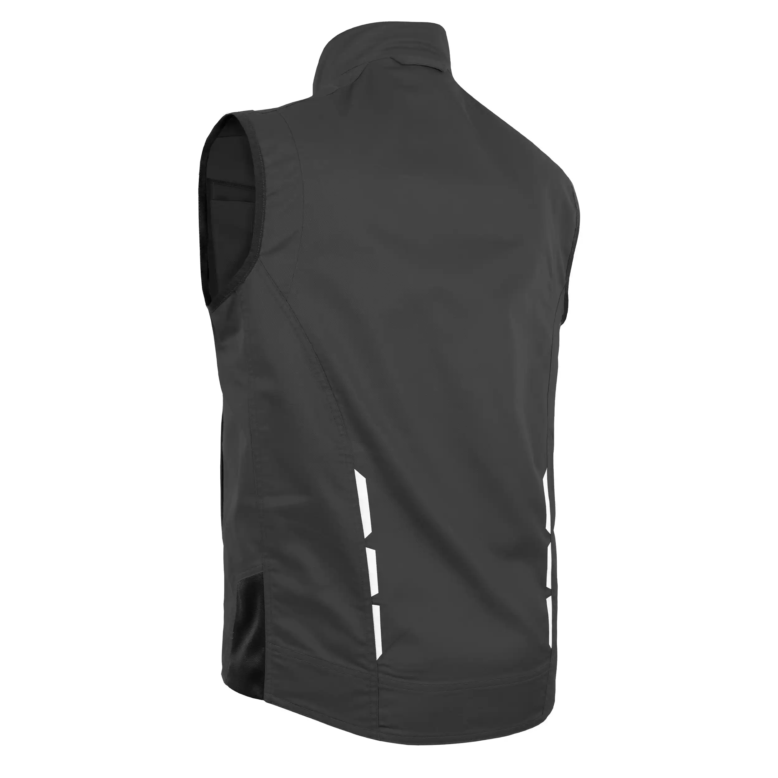 Der Schnitt der Weste ist modern tailliert gehalten und sitzt dank der schmalen Schnittführung auch bei viel Bewegung sicher an Ort und Stelle. Verschlossen wird sie über einen durchgehend abgedeckten Frontreißverschluss, der in einem mittelhohen Stehkragen endet. Der verlängerte Rücken verhindert hierbei ungewolltes Verrutschen.