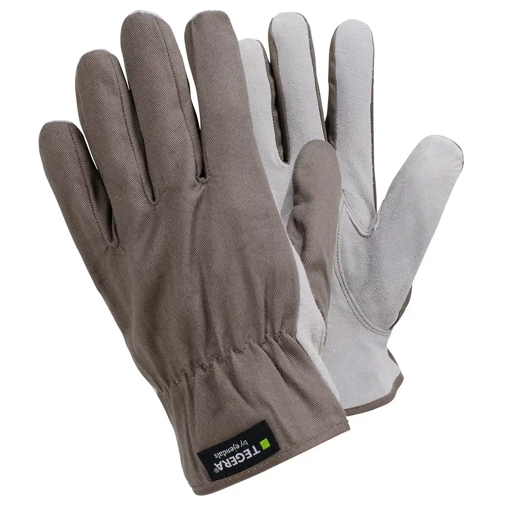 Ein geschmeidiger Handschuh aus strapazierfähigem Rindspaltleder mit Handrücken aus atmungsaktiver Baumwolle. Gummizug über dem Handgelenk. Für Montage-, Werkstatts-, Bauarbeiten.